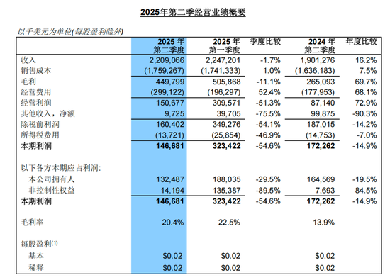 据披露,二季度,公司整体实现销售收入22.09亿美元,环比下降1.7%;毛利率为20.4%,环比下降2.1个百分点;产能利用率92.5%,环比增长了2.9个百分点。