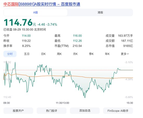 股价方面,中芯国际A股今日跌3.74%,报114.76元/股。该股昨日涨超17%,股价创历史新高。